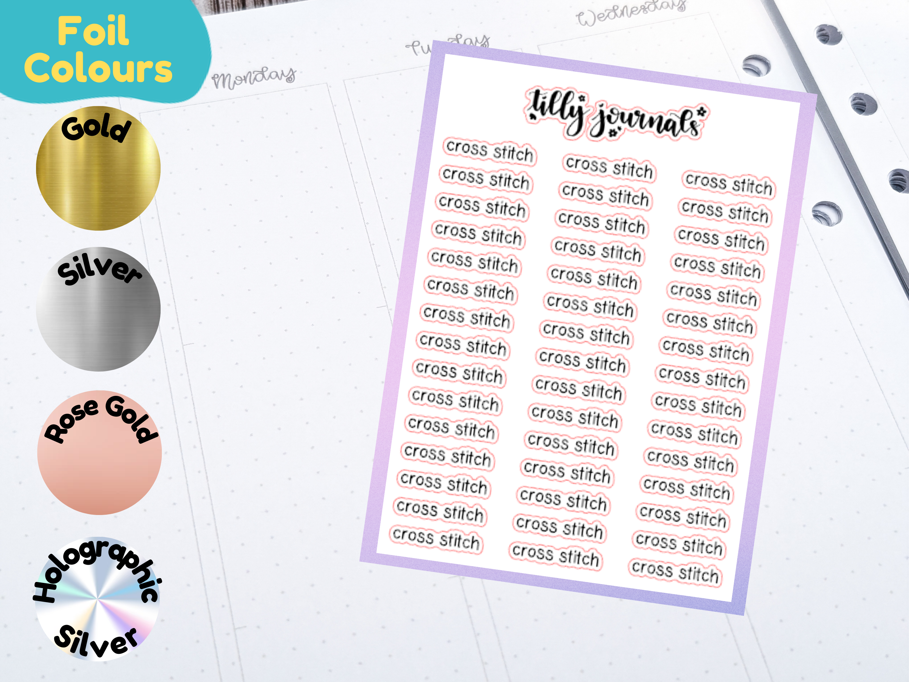 This is a single sheet with real foil containing 50 stickers. Each sticker contains a foiled script which reads: "cross stitch". Available in either Gold, Silver, Soft Rose Gold or Silver Holographic foil, or unfoiled. Choose between our five fonts: Aurora, Belle, Jasmine, Merida and Tiana.