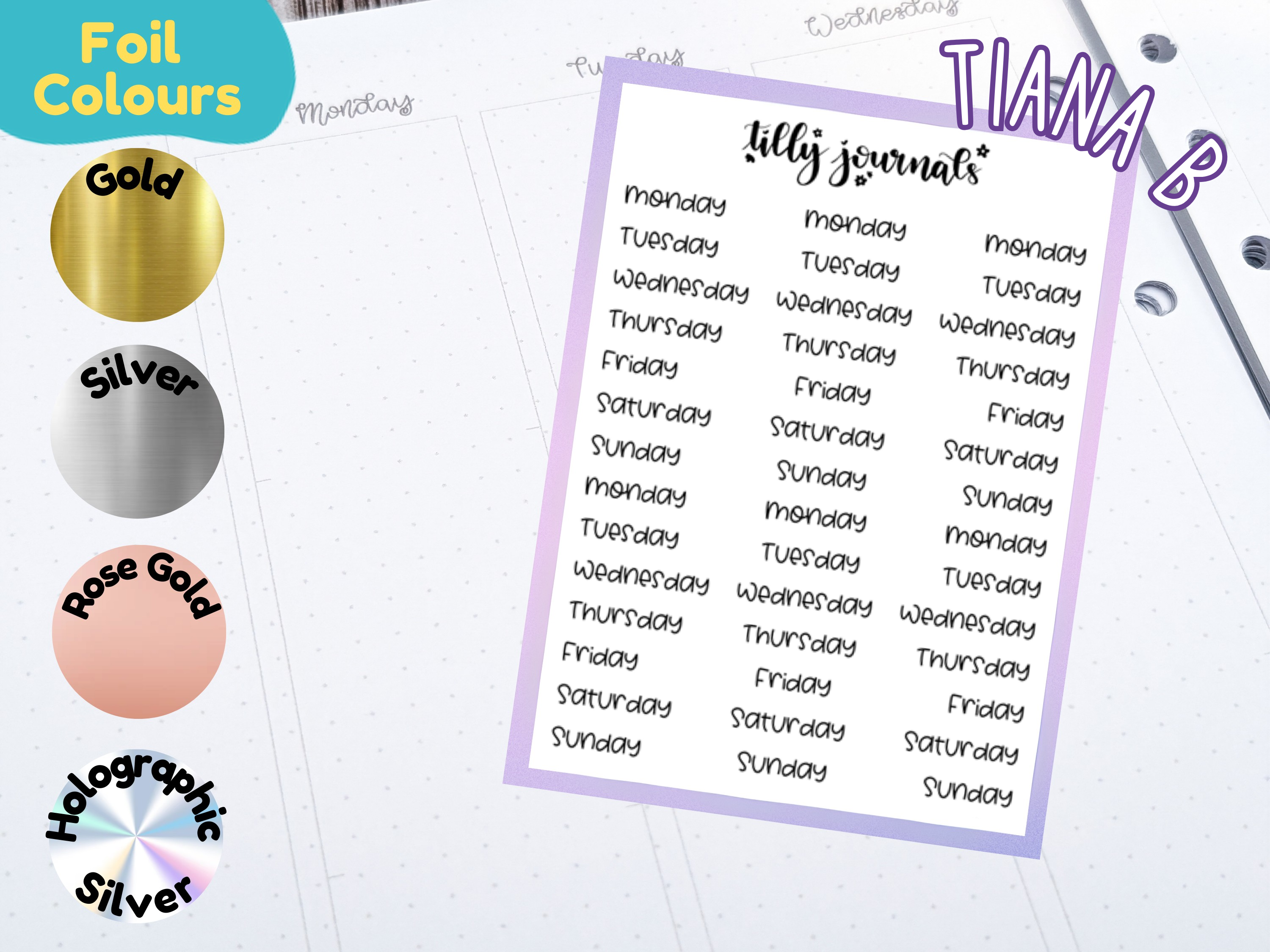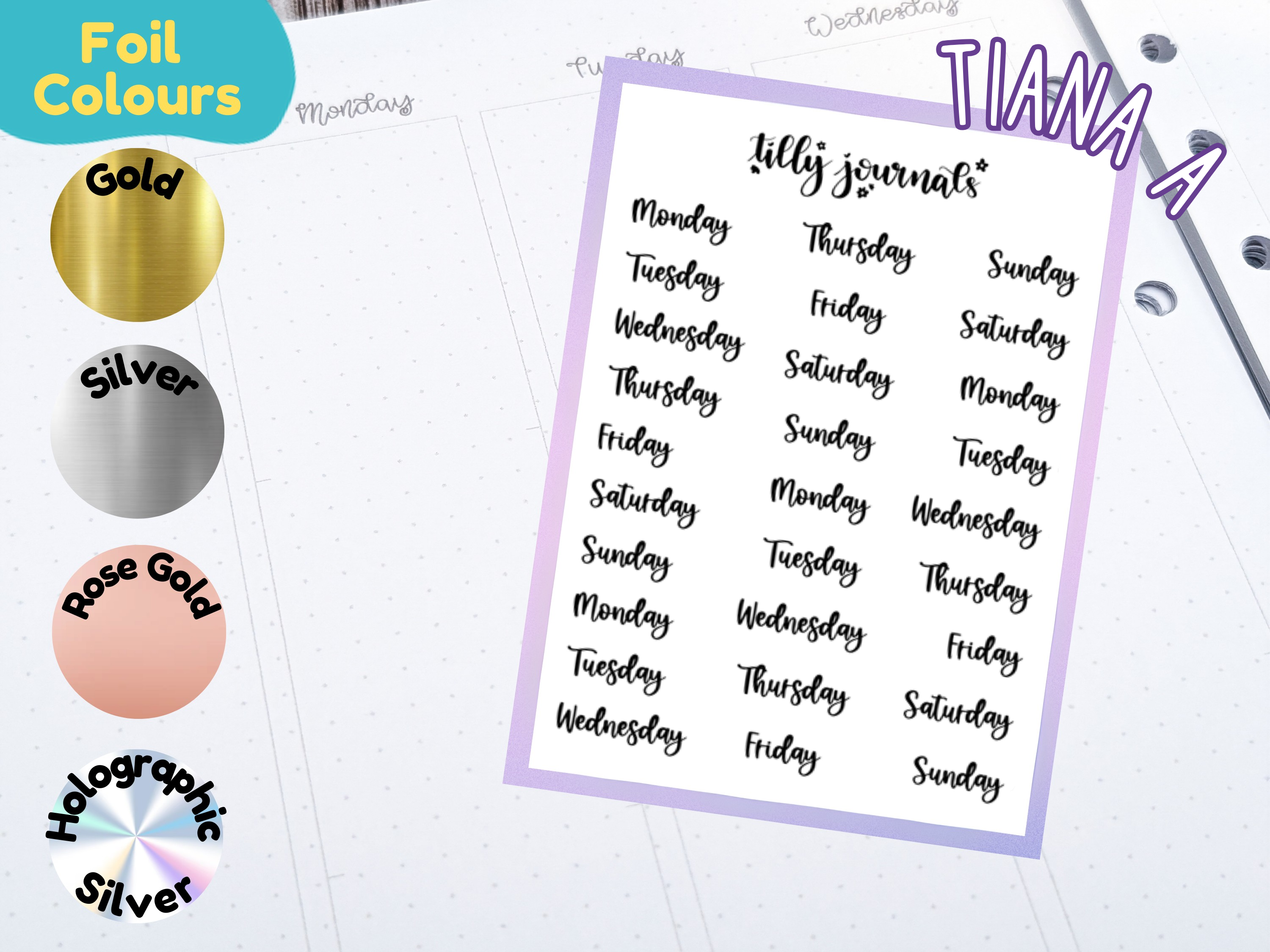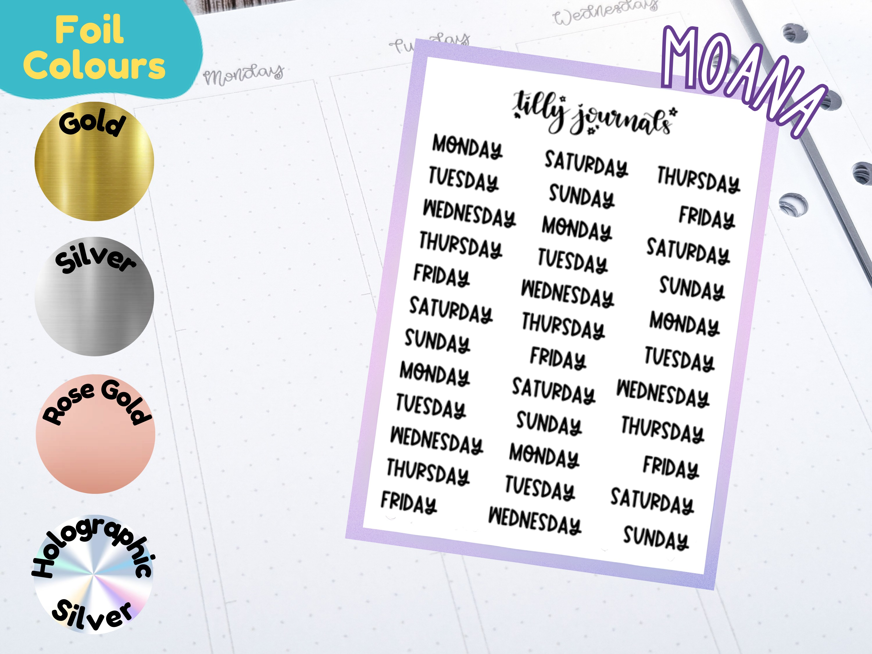 This is a single sheet with real foil containing script stickers of the days of the week. Available in either Gold, Silver, Soft Rose Gold or Silver Holographic foil, or unfoiled. Choose between eight fonts: Aurora, Belle, Elsa, Jasmine, Merida, Moana, Tiana A, and Tiana B.