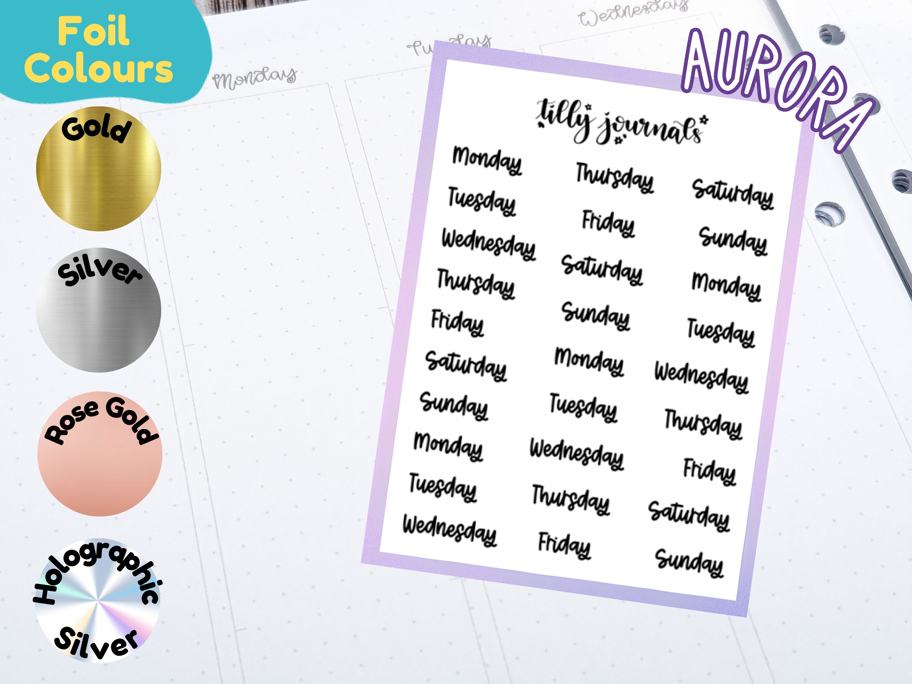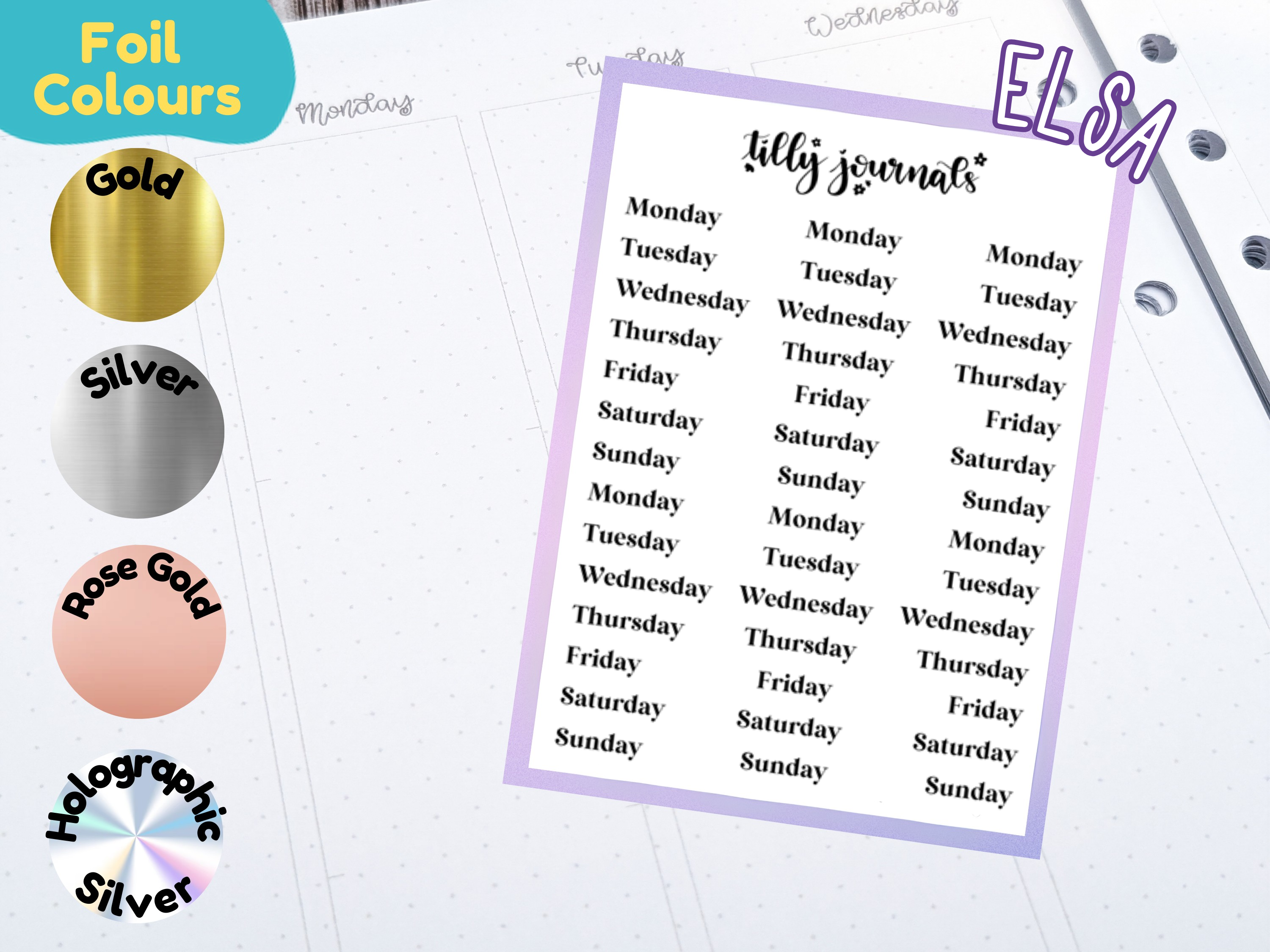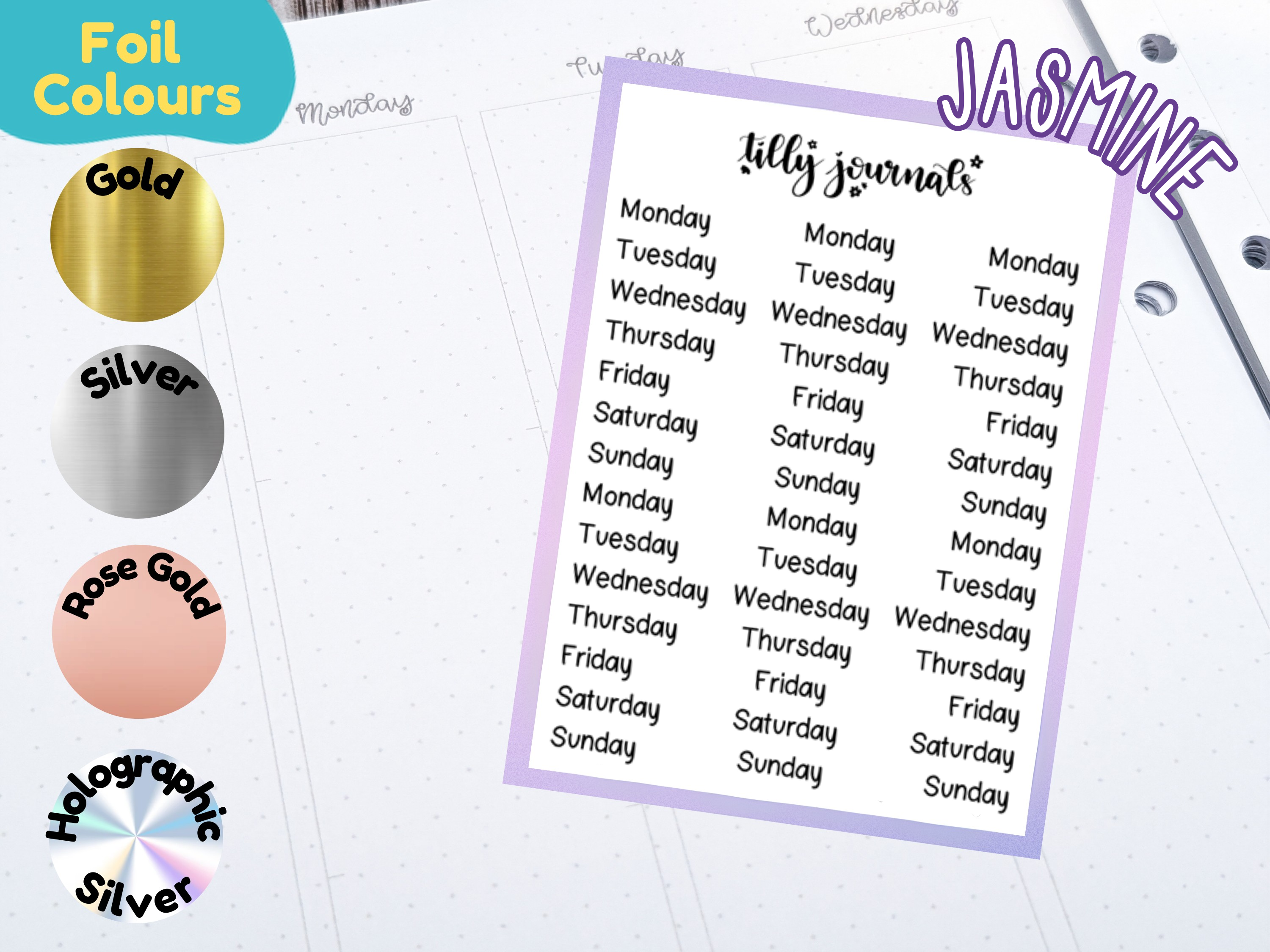 This is a single sheet with real foil containing script stickers of the days of the week. Available in either Gold, Silver, Soft Rose Gold or Silver Holographic foil, or unfoiled. Choose between eight fonts: Aurora, Belle, Elsa, Jasmine, Merida, Moana, Tiana A, and Tiana B.