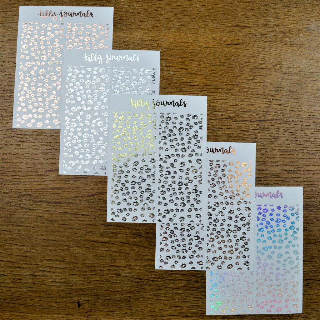 This is a single sheet with real foil containing thirty two stickers, each sized to cover headers in a standard vertical planner. Each sticker contains a pumpkin confetti design. Available in either Gold, Silver, Soft Rose Gold or Silver Holographic foil.