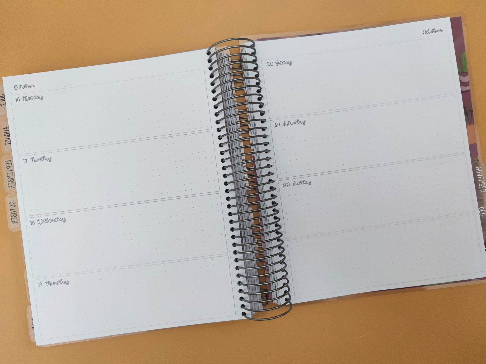 You can choose to add extra notes pages to your planner. You can choose to add one or two spreads (two or four pages) of notes pages in each month, and/or an extra 18 pages at the end of the planner. If you go for monthly pages, these will be after the monthly spread if you have them, or immediately after your dividers if you do not have monthly spreads. For monthly only planners, you can have up to five spreads (10 pages) of notes between each month.
